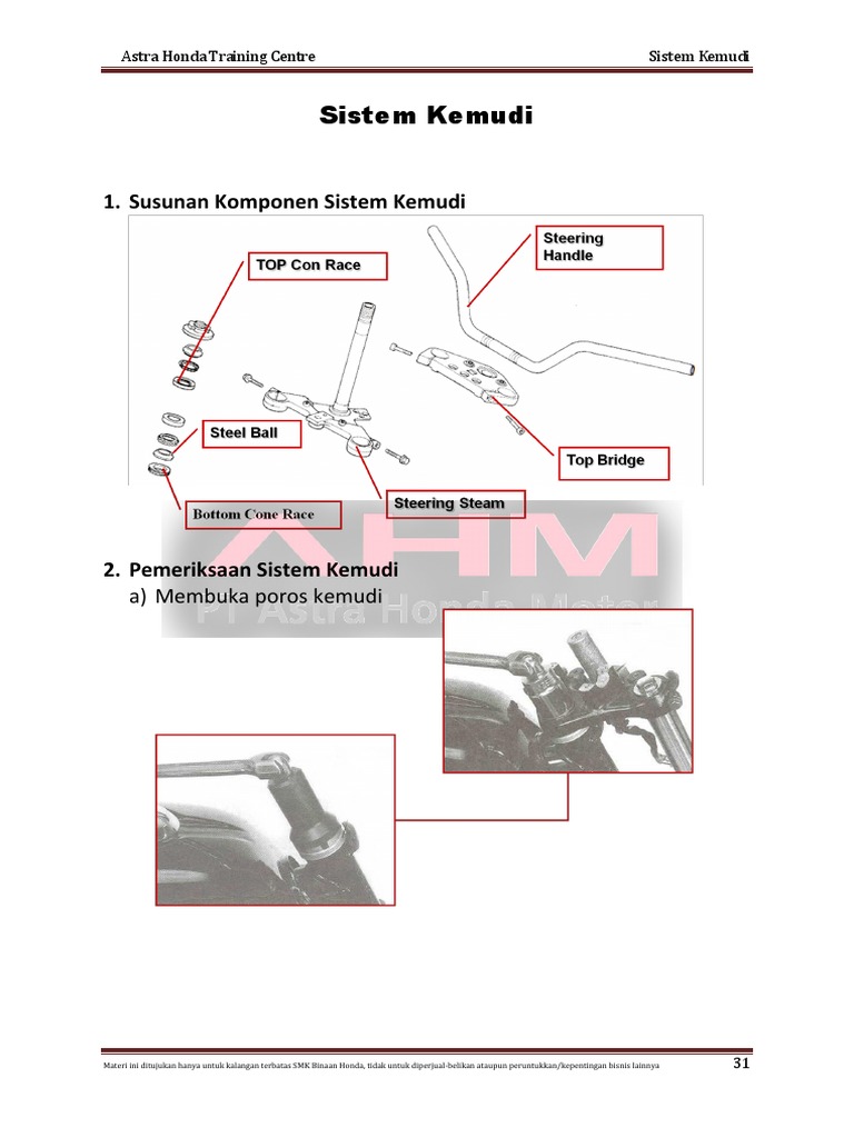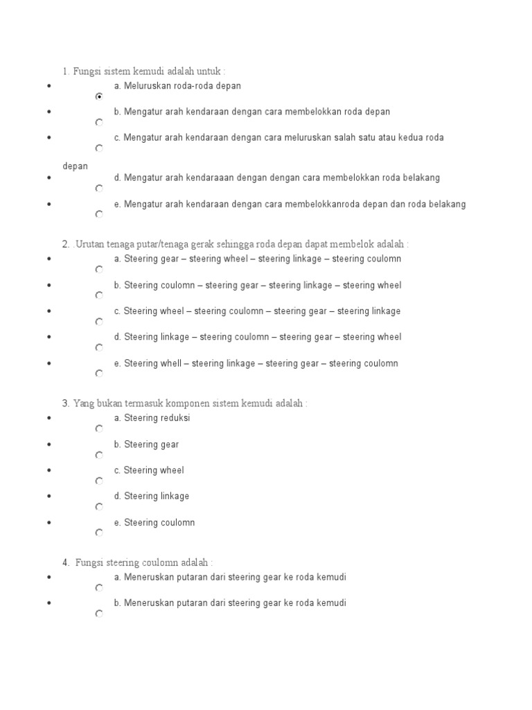 Soal Sistem Kemudi Sepeda Motor - Soal Sistem Kemudi Elearning Web Guru - Modul ini terdiri atas empat (4) kegiatan belajar.. Kegiatan belajar 2 membahas tentang memeriksa, merawat, memperbaiki dan menyetel sistem rem sepeda motor. Garpu, stang kemudi, sambungan kemudi a. Jul 24, 2020 · soal uas sistem kemudi. Mekanisme sistem kemudi sepeda motor c. Soal teori kejuruan otomotif pdf.