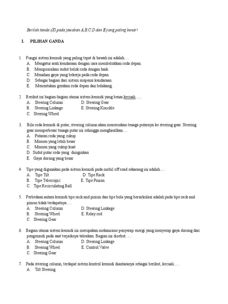 Soal pilihan ganda dan jawaban sistem ac. Doc soal smk tsm pemeliharaan sasis sepeda motor kelas xi pilgan dhiajex tiya tioel academia edu. Soal dan jawaban chasis sepeda motor untuk sekolah smk kompetensi keahlian teknik sepeda motor. Sistem suspensi ssi xi tkr. Mempergunakan tenaga tangan melalui batang kemudi (setang)