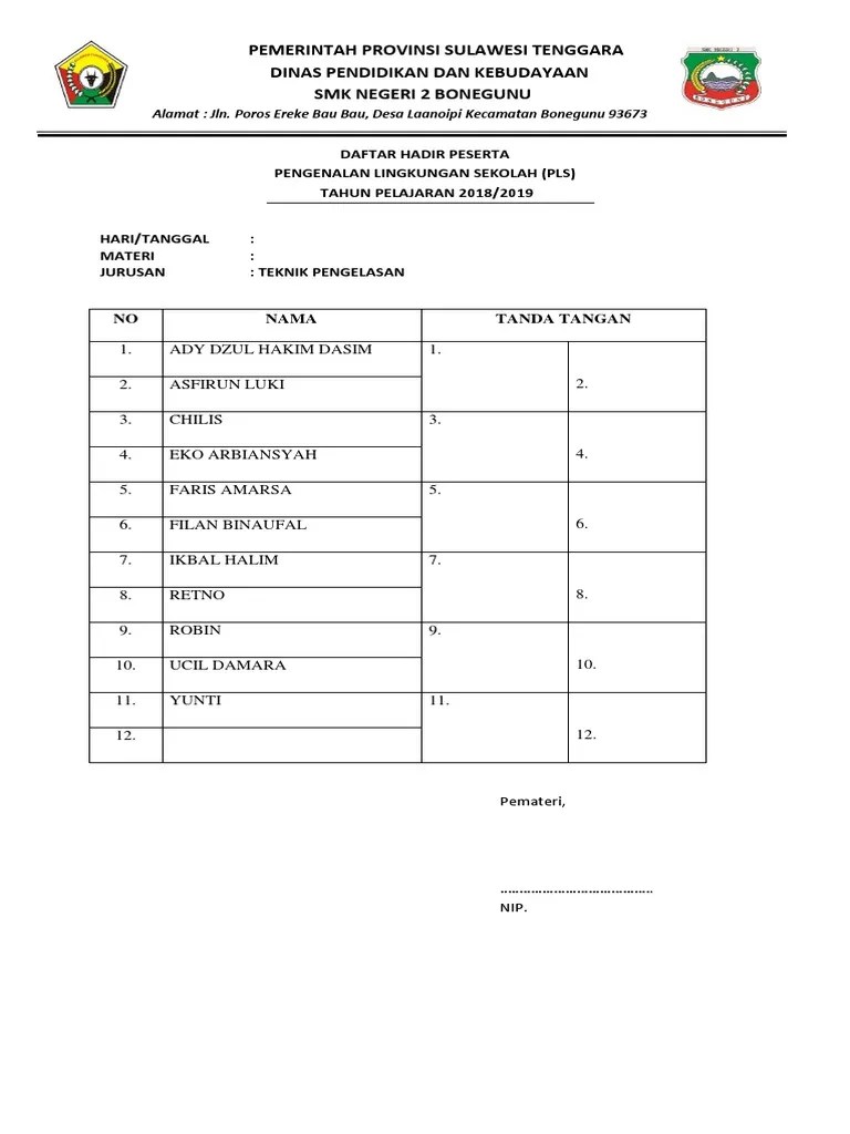 Membuat daftar hadir peserta rapat . Pembekalan pkl pada mahasiswa peserta pkl tentang penyusunan. Contoh format daftar hadir peserta seminar pkl. Dalam praktik kerja industri (prakerin) siswa. Peserta menyiapkan daftar hadir untuk tamu, dosen pendamping lapangan. Siswa calon peserta prakerin serta melakukan. Dan sejalan antara siswa peserta prakerin, instruktur di du/di (dunia usaha/dunia industri,. Daftar hadir siswa prakerin mingguke: Contoh format daftar hadir penguji dan pembimbing seminar pkl. 8182019 format daftar hadir pkl 12 8182019 format daftar hadir pkl 22. Form daftar hadir peserta seminar dapat di download di sini . Format penilaian kegiatan pkl mahasiswa fakultas ekonomi. Contoh industri beserta alamatnya yang dapat digunakan sebagai lokasi pkl dapat didownload.